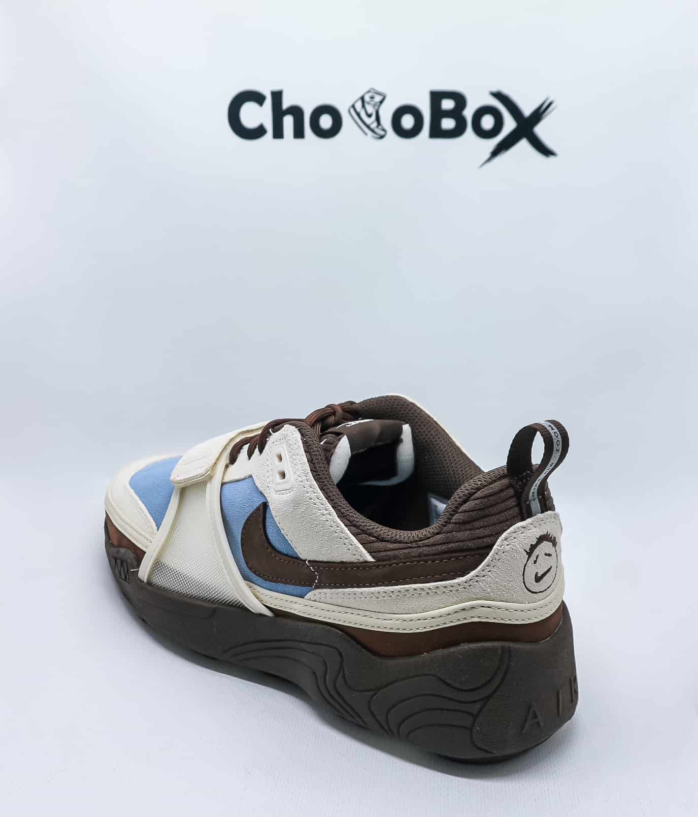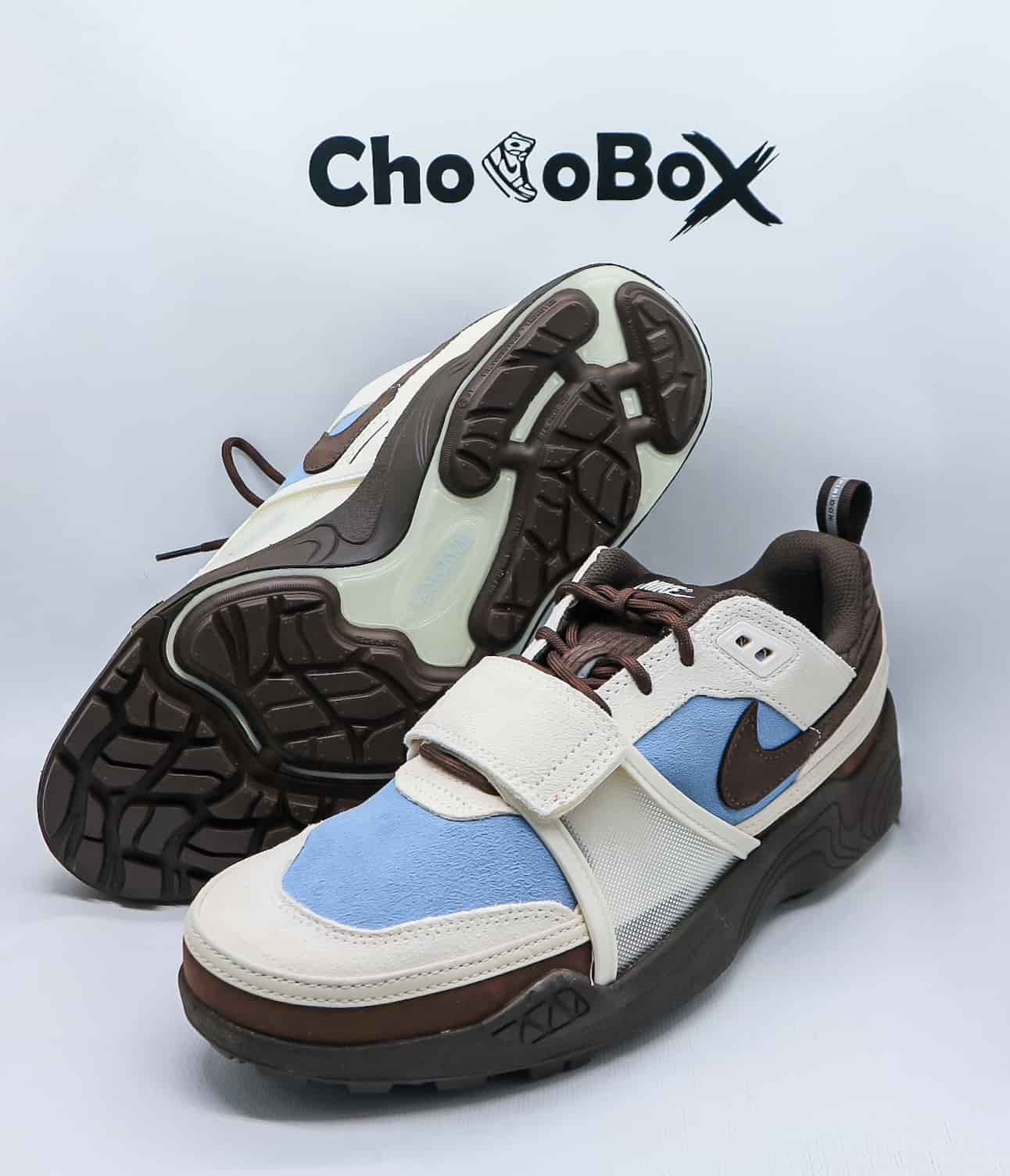 The Travis Scott x Nike Zoom Field Jaxx ‘Leche Blue’ features a brown foam midsole sourced from the 1997 Zoom Spiridon. A full-length Zoom Air unit is incorporated into the segmented rubber outsole. These sneakers are inspired by the Nike Land Shark from the 1990s, with a blue suede upper and khaki overlays. The adjustable midfoot strap brings a lockdown feel, while Baroque brown touches land on the collar, Swoosh and tongue, which sports the Nike and Cactus Jack logos.